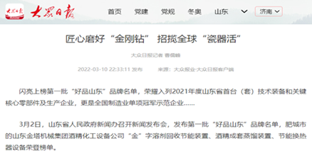 榮耀閃閃,品牌彰顯。 近日,2022年山東省優(yōu)質(zhì)品牌榜單揭曉。山東金塔機(jī)械集團(tuán)“廢液蒸發(fā)成套裝備”、“用于熱敏性物料的蒸發(fā)裝置”榮耀上榜。至此,自2019年榜單發(fā)布以來(lái),金塔集團(tuán)共有10項(xiàng)產(chǎn)品榮獲山東優(yōu)質(zhì)品牌稱號(hào)。 山東金塔集團(tuán)守正創(chuàng)新強(qiáng)主業(yè),精耕細(xì)作鑄品牌,突出以科技創(chuàng)新強(qiáng)化品牌支撐,年年出成果,歲歲有專利,新工藝、新技術(shù)、新產(chǎn)品拓寬了市場(chǎng)新領(lǐng)域。作為《酒精蒸餾塔》、《糠醛水解鍋》、《糠醛蒸餾塔》等20余項(xiàng)國(guó)家行業(yè)標(biāo)準(zhǔn)的制定者,金塔集團(tuán)聚焦雙碳目標(biāo),把控綠色節(jié)能方向,牢牢占據(jù)行業(yè)制高點(diǎn),贏得了市場(chǎng)話語(yǔ)權(quán)。通過(guò)深入實(shí)施品牌戰(zhàn)略,致力打造自主品牌,金塔產(chǎn)品質(zhì)量?jī)?yōu)、品質(zhì)好、標(biāo)準(zhǔn)化的綜合優(yōu)勢(shì)得到全方位厚植。 金塔品牌靚,展示好形象。“金”字及圖商標(biāo),中國(guó)馳名商標(biāo);首批“好品山東”,金塔榮耀其中;山東優(yōu)質(zhì)品牌,連年完美上榜…金塔在出新中更加出彩,品牌在打造中愈加閃亮。 品牌閃爍,金塔增色。以品牌樹(shù)形象,以品牌闖市場(chǎng),金塔品牌之路越走越寬廣,為助推企業(yè)高質(zhì)量發(fā)展注入了強(qiáng)大動(dòng)能。